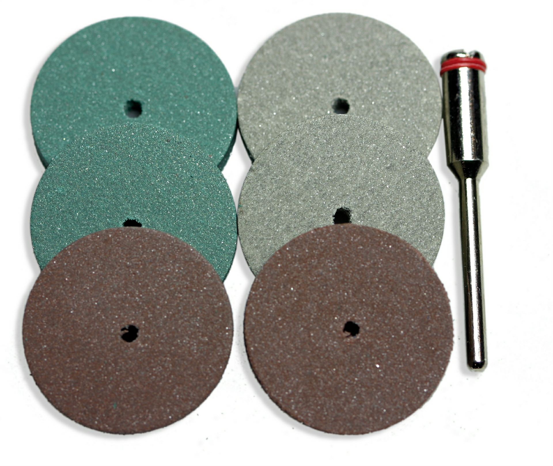 Polier-und Schleifrad zur Bearbeitung von NE-Metallen, Körnung: rot-braun 80-100#, grün 240#, grau 800#, mit Spindel Schaft 2,35mm